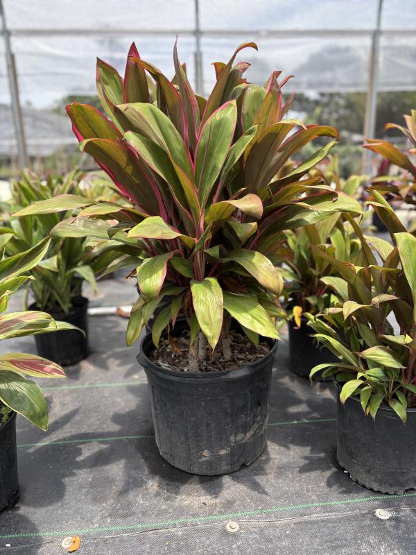 Ti Plant 'Maria' (Cordyline fruticosa 'Maria') is a vibrant tropical plant known for its bold, colorful foliage. The leaves display a striking mix of deep burgundy, green, and pink tones, making it a popular choice for adding contrast and drama to landscapes or container gardens. It prefers warm, humid conditions and thrives in well-drained soil.