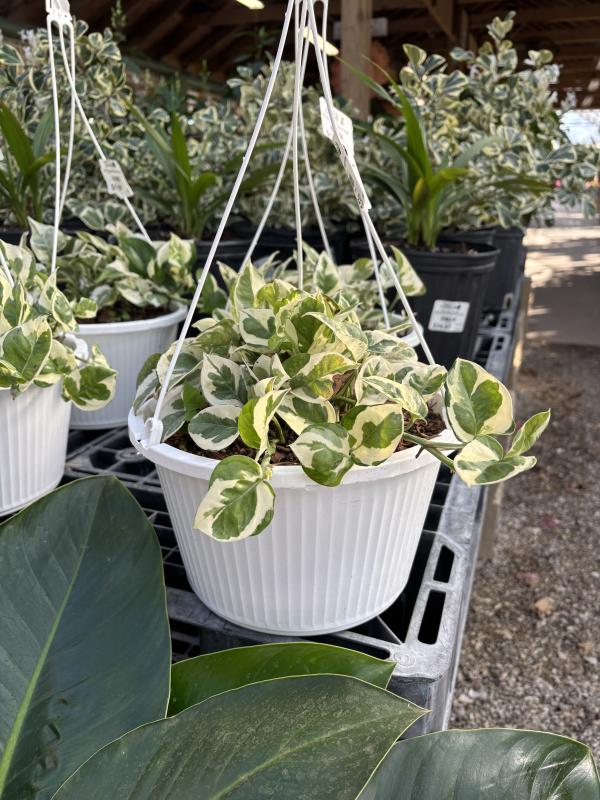 Pothos (Epipremnum aureum) is a hardy, trailing vine known for its lush, heart-shaped leaves that come in shades of green, variegated with white, yellow, or chartreuse. This low-maintenance plant is highly adaptable, thriving in both bright, indirect light and low-light conditions, making it a popular choice for indoor spaces. Pothos can be grown in hanging baskets, climbing structures, or as a ground cover in tropical gardens. It is also an excellent air purifier and requires minimal watering, making it a perfect plant for beginners.