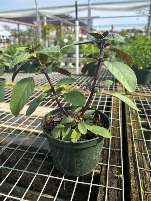 African Blue Basil (Ocimum kilimandscharicum × basilicum) is a hybrid basil variety known for its aromatic, flavorful leaves that have a unique blend of basil and camphor scents. This perennial herb thrives in Florida’s warm climate and is perfect for growing in gardens, containers, or as an ornamental plant. It produces small, purple flowers that attract pollinators and has a strong, spicy flavor ideal for cooking and garnishing.