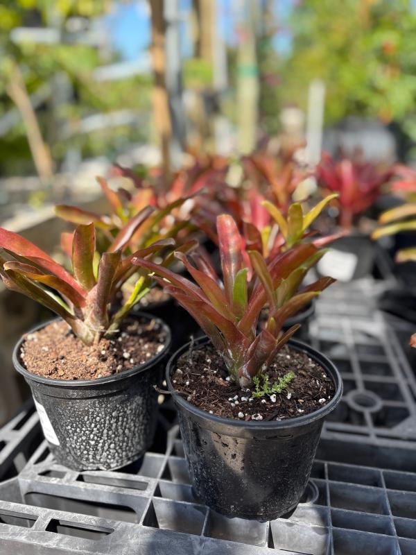 Bromeliad 'Neoregelia' (Neoregelia spp.) is a compact, low-growing bromeliad prized for its vibrant foliage rather than its flowers. Its broad, strappy leaves often feature striking colors like green, red, pink, or purple, sometimes with mottled or banded patterns. The central cup may turn a brilliant red or pink at flowering time, adding to its ornamental value.