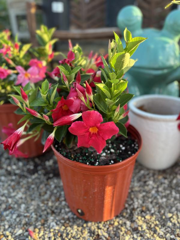 Dipladenia (Mandevilla spp.) is a tropical flowering shrub known for its vibrant, trumpet-shaped flowers that bloom in a range of colors, including pink, red, and white. It has glossy, dark green leaves and a sprawling growth habit, making it ideal for trellises, fences, or hanging baskets. Dipladenia thrives in full sun and well-drained soil, offering a stunning display of blooms throughout the warmer months. It’s a great choice for adding color and tropical flair to landscapes or container gardens.