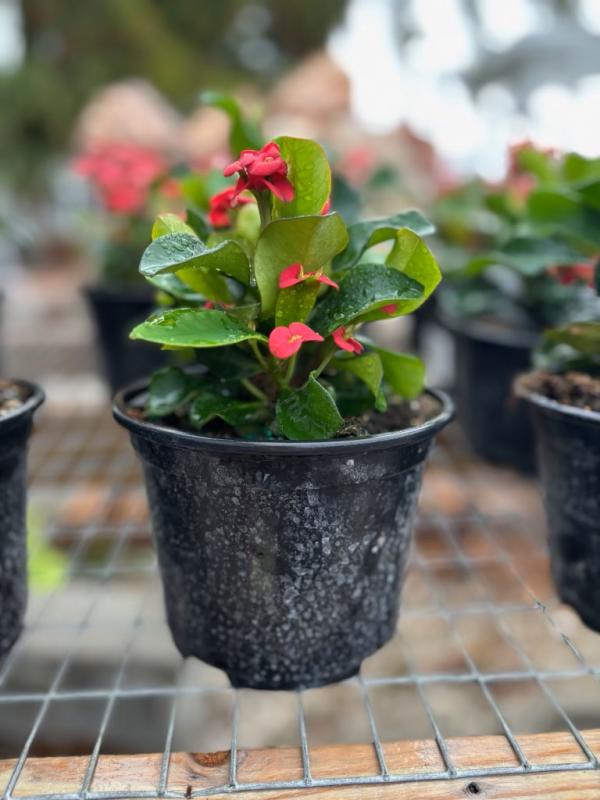 The Dwarf Crown of Thorns (Red) is a compact, thorny shrub known for its striking red flowers that bloom year-round in warm climates. This hardy plant features succulent-like leaves and spiny stems, making it an excellent choice for adding color and texture to low-maintenance gardens, containers, or borders. It thrives in full sun and is drought-tolerant once established, making it well-suited to hot and dry conditions.