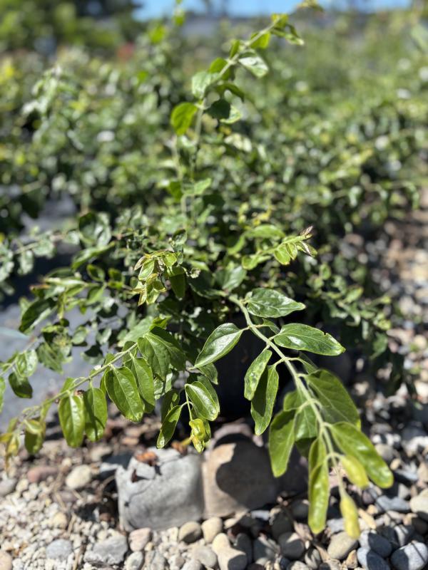 Jasmine 'Downey White' (Jasminum sambac 'Downey') is a compact, evergreen shrub prized for its intensely fragrant, pure white flowers. The blooms resemble miniature roses and appear most abundantly in warmer months. This variety is often used in containers, as a low hedge, or in fragrance gardens due to its lush foliage and delightful scent.