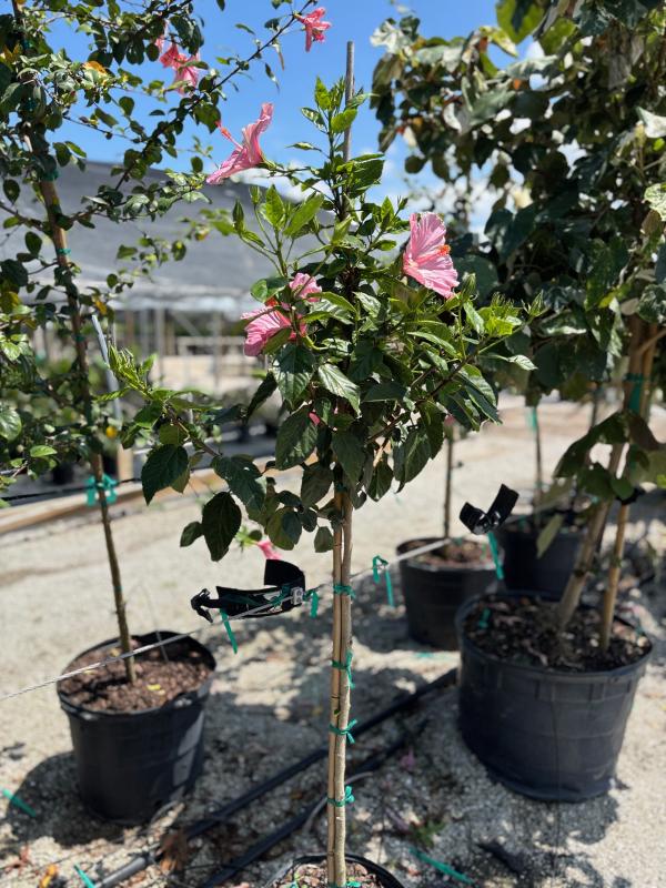 Hibiscus rosa-sinensis 'Seminole Pink Standard' is a tropical hibiscus variety trained into a standard (tree form), known for its soft pink blooms and upright growth habit. The large, single flowers have a delicate charm and bloom prolifically against a backdrop of glossy green foliage. This cultivar is ideal for use as a specimen plant in gardens, patios, or decorative containers, offering year-round beauty in warm climates.