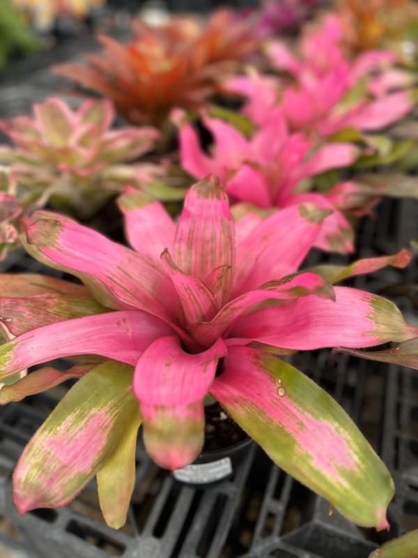 Bromeliad 'Neoregelia' (Neoregelia spp.) is a compact, low-growing bromeliad prized for its vibrant foliage rather than its flowers. Its broad, strappy leaves often feature striking colors like green, red, pink, or purple, sometimes with mottled or banded patterns. The central cup may turn a brilliant red or pink at flowering time, adding to its ornamental value.