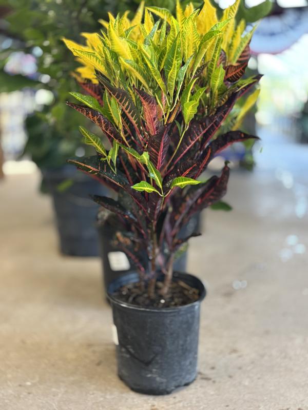 Croton (Codiaeum variegatum) is a bold, tropical shrub known for its brilliantly colored foliage in shades of red, yellow, orange, green, and even purple. Its leathery, glossy leaves come in a variety of shapes, and it makes an excellent focal point in landscapes or as a container plant in warm climates. Crotons prefer humidity and bright, indirect light but can tolerate some direct sun.
