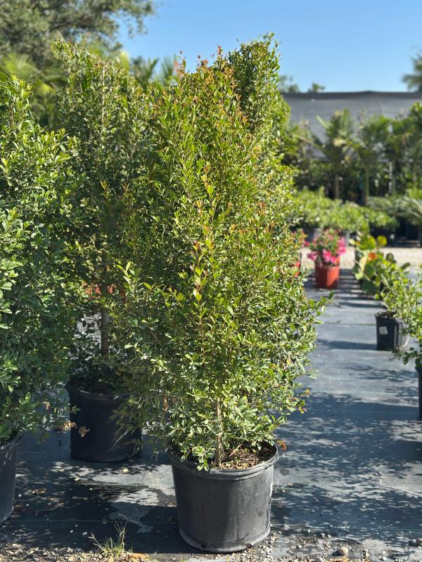 Eugenia (Eugenia spp.) is a versatile evergreen shrub commonly used in Florida landscapes. It is prized for its dense, glossy green foliage and is often shaped into many different forms, including formal hedges, topiaries, and screens. This adaptability makes it a favorite for decorative and privacy plantings. It produces small white flowers followed by dark berries that attract wildlife.
