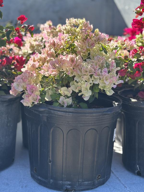 Sunstone Bougainvillea (Bougainvillea 'Sunstone') is a vibrant, evergreen climber known for its striking white or red bracts that provide a brilliant splash of color. This variety is often used in landscapes for covering trellises, walls, or fences, and can also be pruned into a shrub or standard form.