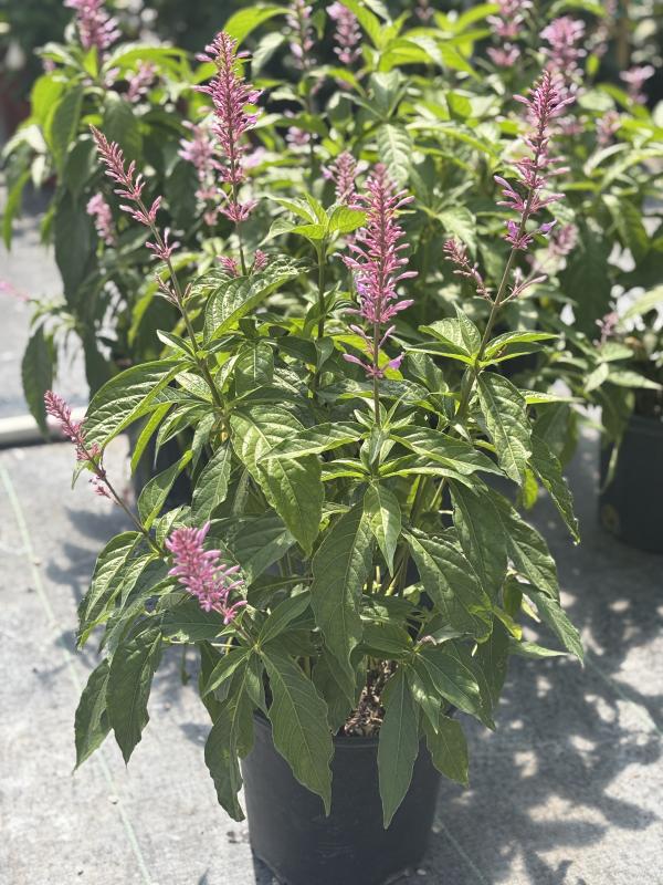 Lavender Firespike (Odontonema callistachyum) is a striking, evergreen shrub known for its vibrant spikes of tubular lavender flowers that bloom year-round in warmer climates. This plant is valued for its ability to attract hummingbirds and butterflies, making it an excellent choice for pollinator-friendly gardens. The slender, green leaves provide a backdrop to the colorful flowers, creating an eye-catching display in both landscapes and containers.