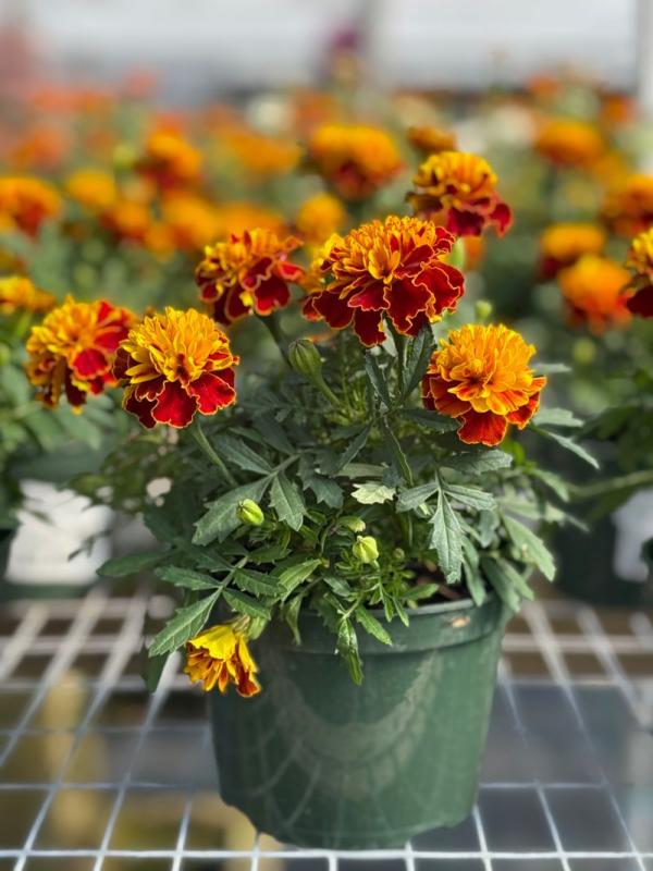 Marigold (Tagetes spp.) is a popular annual known for its bright, cheerful flowers and ease of care. It produces vibrant blooms in shades of yellow, orange, and red, attracting pollinators like bees and butterflies. Marigolds are commonly used in garden beds, containers, and hanging baskets, known for their ability to bloom continuously throughout the growing season while tolerating a variety of soil types.