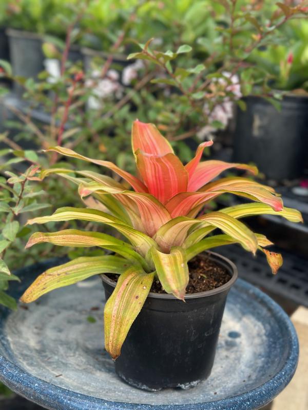 Bromeliad 'Neoregelia' (Neoregelia spp.) is a compact, low-growing bromeliad prized for its vibrant foliage rather than its flowers. Its broad, strappy leaves often feature striking colors like green, red, pink, or purple, sometimes with mottled or banded patterns. The central cup may turn a brilliant red or pink at flowering time, adding to its ornamental value.