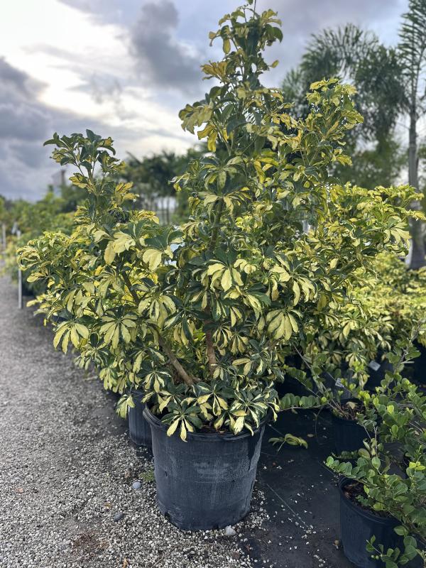 Arboricola Trinette (Schefflera arboricola'Trinette') is a compact, evergreen shrub with variegated green and creamy-yellow leaves that add a vibrant touch to landscapes. This plant thrives in a variety of conditions, tolerating both full sun and full shade, making it versatile for various garden settings in Florida. Its striking foliage and moderate growth rate make it a great choice for hedges or foundation plantings.