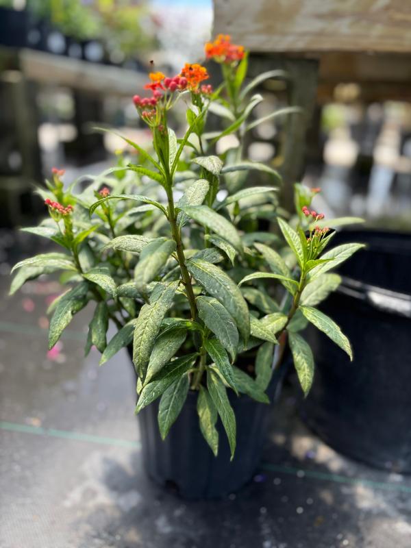 Tropical Milkweed (Asclepias curassavica) is a vibrant, perennial plant known for its clusters of bright orange, red, or yellow flowers that attract pollinators like butterflies, particularly the monarch. It thrives in full sun and well-drained soil, making it a popular addition to gardens and landscapes.