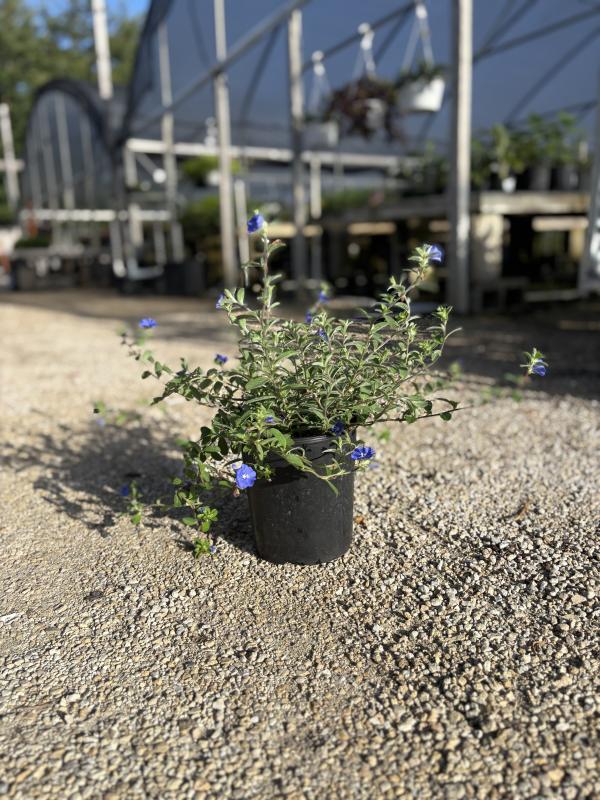 Blue Daze 'Old Fashioned' (Evolvulus glomeratus) is a classic variety prized for its trailing habit and continuous display of soft, sky-blue flowers. Its fuzzy, gray-green leaves create a beautiful contrast with the blooms, and it performs well in hot, dry locations. This variety is ideal for hanging baskets, borders, and groundcover applications in full sun.