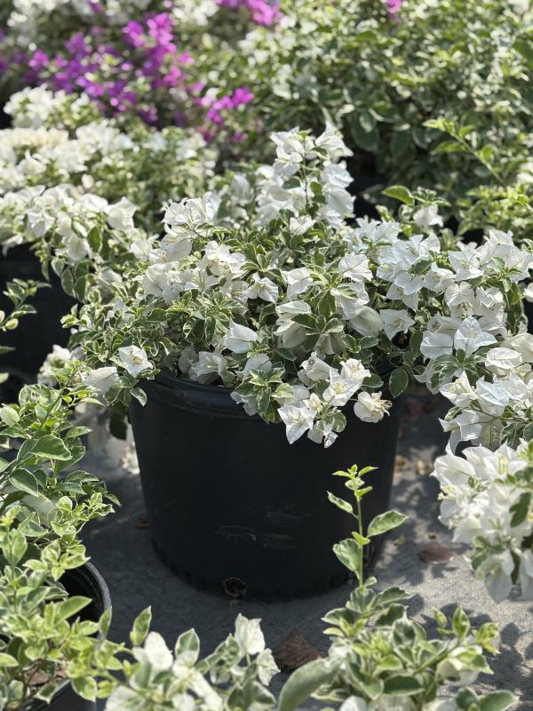 Bougainvillea 'Coconut Ice'(Bougainvilleaspp.) is a stunning variety known for its unique blend of soft white bracts that resemble coconut husk in their delicacy. This tropical vine is perfect for adding a splash of color to gardens, walls, or trellises, and is highly valued for its vibrant flowering display. 'Coconut Ice' thrives in full sun and can be used as a showy accent or a privacy screen.