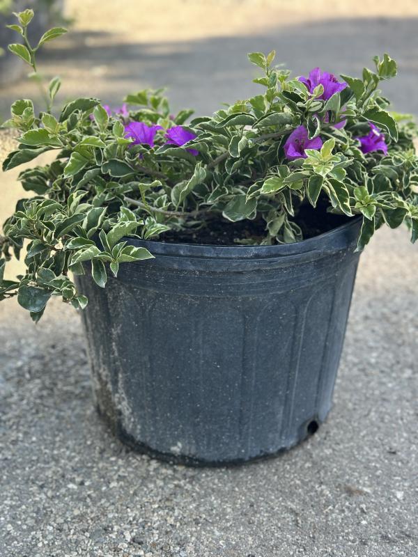 The Blueberry Ice Bougainvillea is a vibrant, ornamental shrub known for its striking purple bracts that resemble petals, complemented by green and white variegated foliage. This variety is particularly hardy, thriving in warmer climates and blooming profusely from spring to fall. Available in 3-7 gallon sizes, it adds a splash of color to landscapes and is great for trellises, fences, or as a colorful groundcover.
