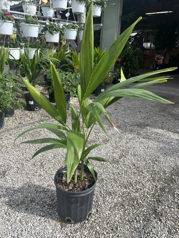 Christmas Palm (Adonidia merrillii), also known as Manila Palm, is a compact, elegant palm known for its smooth, gray trunk and arching fronds. It gets its name from the bright red fruits that appear in clusters during the holiday season, adding festive color to the landscape. It is ideal for small spaces, containers, or as a striking accent palm.