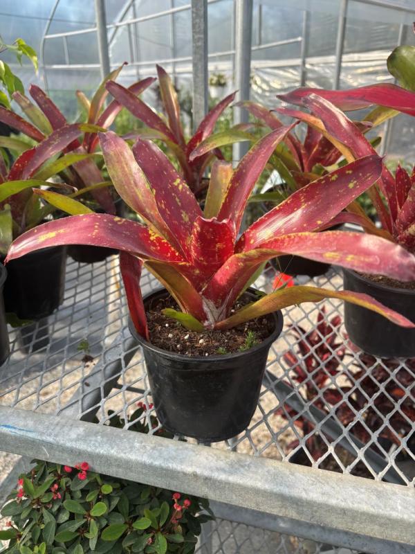 Bromeliad 'Neoregelia' (Neoregelia spp.) is a compact, low-growing bromeliad prized for its vibrant foliage rather than its flowers. Its broad, strappy leaves often feature striking colors like green, red, pink, or purple, sometimes with mottled or banded patterns. The central cup may turn a brilliant red or pink at flowering time, adding to its ornamental value.