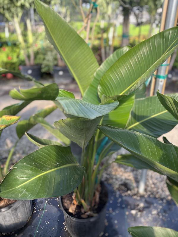 White Bird of Paradise (Strelitzia nicolai) is a striking, tropical plant known for its large, fan-shaped leaves and dramatic, bird-like white flowers. This plant is often grown for its unique, ornamental appearance and impressive size, making it a popular choice for landscaping in warm climates. The plant can reach tree-like proportions and is excellent for creating a bold, tropical atmosphere in gardens or as an indoor container plant, where it will stay the same size out of sunlight.