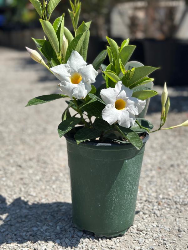 Dipladenia (Mandevilla spp.) is a tropical flowering shrub known for its vibrant, trumpet-shaped flowers that bloom in a range of colors, including pink, red, and white. It has glossy, dark green leaves and a sprawling growth habit, making it ideal for trellises, fences, or hanging baskets. Dipladenia thrives in full sun and well-drained soil, offering a stunning display of blooms throughout the warmer months. It’s a great choice for adding color and tropical flair to landscapes or container gardens.