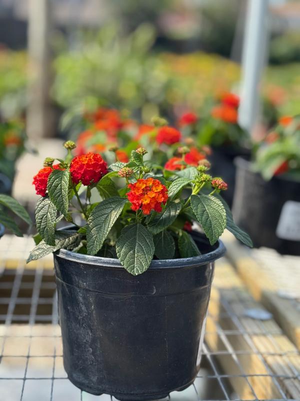 Lantana 'Gem Compact' (Lantana camara) is a low-growing, mounding shrub known for its continuous blooms and compact growth habit. It produces clusters of vibrant flowers that attract butterflies and other pollinators. This hardy plant thrives in heat and drought conditions, making it an excellent choice for garden beds, borders, and containers