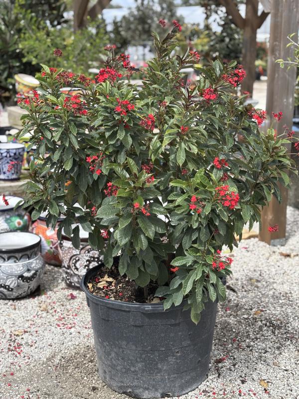 Jatropha (Jatropha integerrima) is a tropical shrub known for its striking clusters of bright red, pink, or yellow flowers that attract pollinators such as butterflies and hummingbirds. This evergreen shrub is commonly used as a hedge or accent plant in Florida gardens, thanks to its vibrant blooms and ability to thrive in full sun. It is drought-tolerant, heat-resistant, and well-suited to Florida’s subtropical climate.
