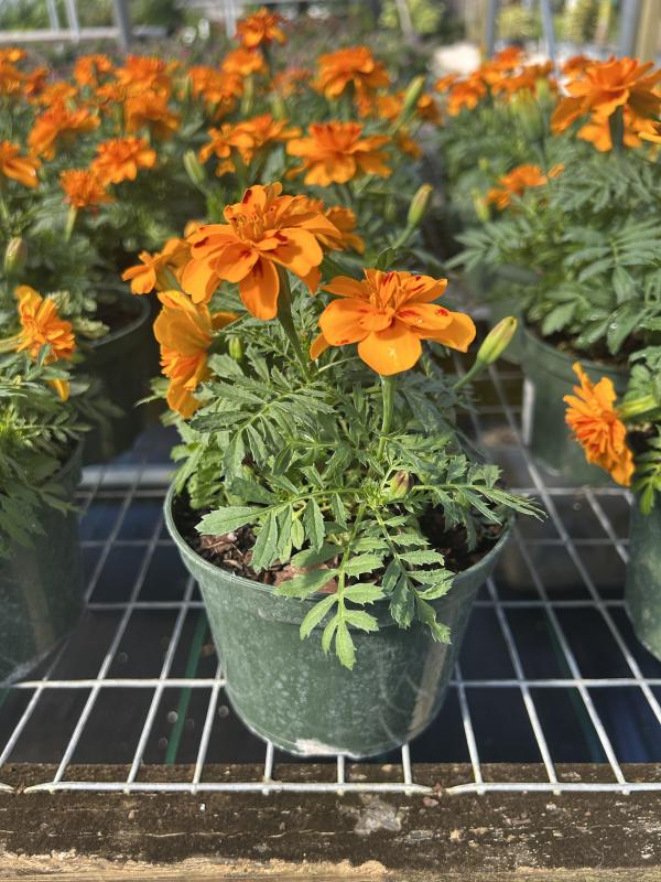 Marigold (Tagetes spp.) is a popular annual known for its bright, cheerful flowers and ease of care. It produces vibrant blooms in shades of yellow, orange, and red, attracting pollinators like bees and butterflies. Marigolds are commonly used in garden beds, containers, and hanging baskets, known for their ability to bloom continuously throughout the growing season while tolerating a variety of soil types.