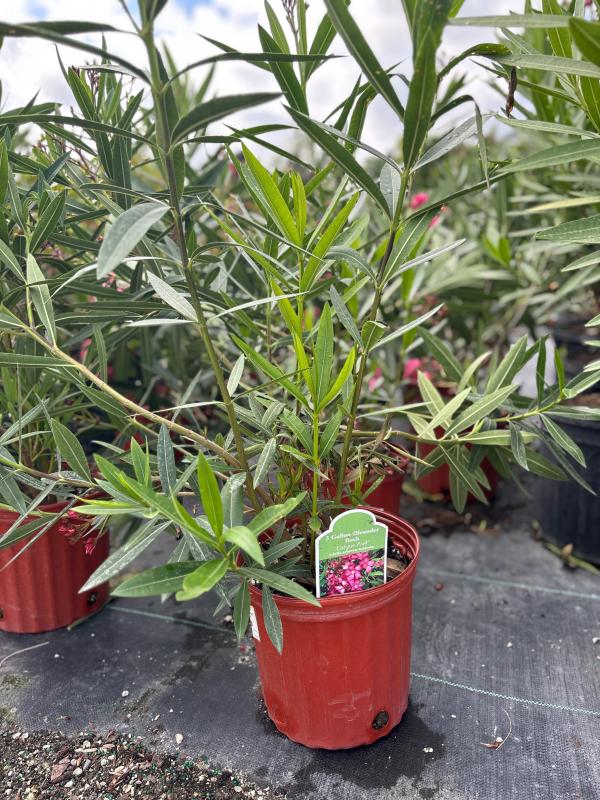 Calypso Oleander (Nerium oleander 'Calypso') is a robust, evergreen shrub known for its vibrant red-pink, funnel-shaped flowers and dense, dark green foliage. This drought-tolerant plant is commonly used in hedges, borders, and as a specimen plant, providing a long season of color and easy maintenance.