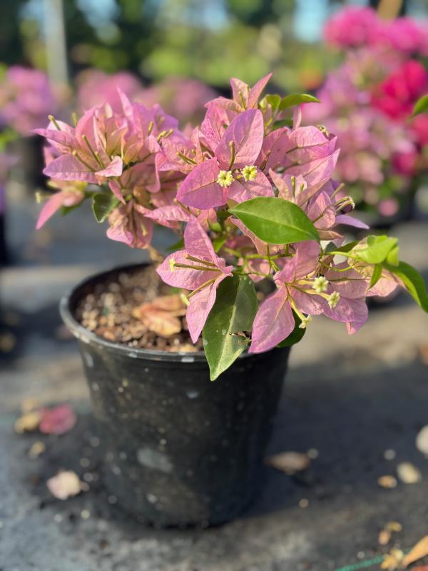 Bougainvillea 'Silhouette' (Bougainvillea 'Silhouette') is a striking vine variety admired for its pale pink to soft lavender bracts that create a delicate, cascading display. This cultivar features a more compact, arching growth habit, making it suitable for smaller trellises, hanging baskets, or as a feature in containers.