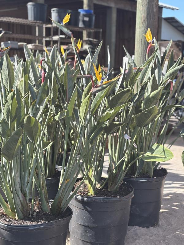 Gold Bird of Paradise (Strelitzia reginae) is a striking tropical plant known for its bold foliage and vivid orange and blue flowers that resemble a bird in flight. It creates a dramatic focal point in gardens or large containers and thrives in warm, sunny environments.