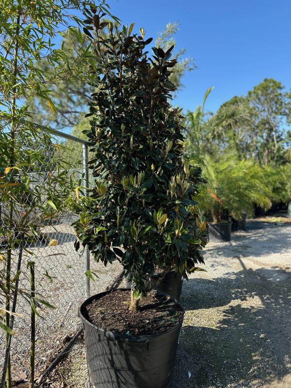 Magnolia 'Little Gem' (Magnolia grandiflora 'Little Gem') is a dwarf variety of the Southern Magnolia, valued for its compact size and elegant appearance. It features glossy, dark green leaves with velvety brown undersides and produces large, fragrant white flowers throughout the warmer months, making it ideal for smaller landscapes or tight spaces.
