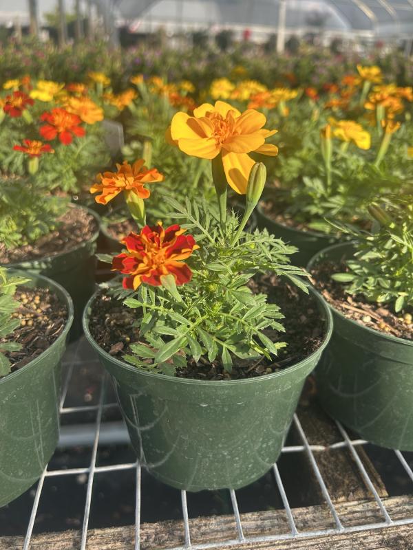 Marigold (Tagetes spp.) is a popular annual known for its bright, cheerful flowers and ease of care. It produces vibrant blooms in shades of yellow, orange, and red, attracting pollinators like bees and butterflies. Marigolds are commonly used in garden beds, containers, and hanging baskets, known for their ability to bloom continuously throughout the growing season while tolerating a variety of soil types.