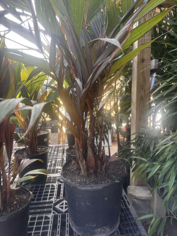 Areca Palm 'Vestiaria' (Dypsis vestiaria) is a striking palm admired for its vivid red to orange crownshaft and elegant, arching fronds. Native to rainforests, it brings a dramatic tropical flair to shaded gardens or container arrangements. This palm prefers moist, well-drained soil and protection from full sun in hot climates.