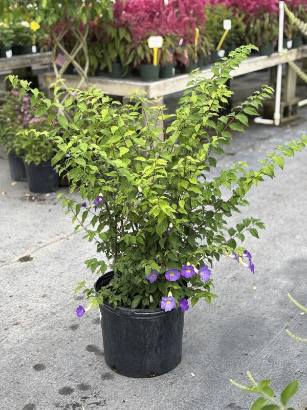 King's Mantle (Thunbergia erecta) is an evergreen shrub known for its striking, large, trumpet-shaped purple or blue flowers with a white center. This plant is often used in landscapes for its dramatic floral display and ability to thrive in both full sun and partial shade. With its vibrant blooms and lush green foliage, King's Mantle makes an excellent addition to tropical or subtropical gardens, and it can also be grown in containers for patios or balconies.