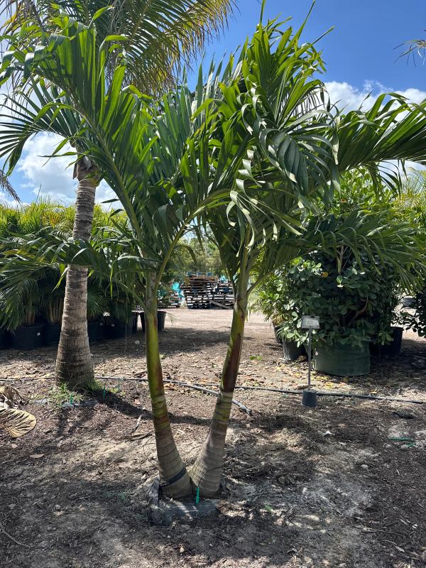 Christmas Palm (Adonidia merrillii), also known as Manila Palm, is a compact, elegant palm known for its smooth, gray trunk and arching fronds. It gets its name from the bright red fruits that appear in clusters during the holiday season, adding festive color to the landscape. It is ideal for small spaces, containers, or as a striking accent palm.
