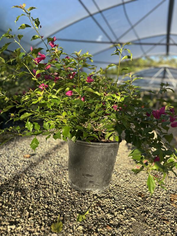 Bougainvillea (Bougainvillea spp.) is a vibrant, fast-growing tropical vine known for its vivid, papery bracts that surround tiny white flowers. Available in a wide array of colors—including magenta, red, orange, pink, white, and purple—Bougainvillea thrives in warm climates and is often used for covering fences, trellises, arbors, or walls. It tolerates drought well once established and adds bold color and texture to the landscape.