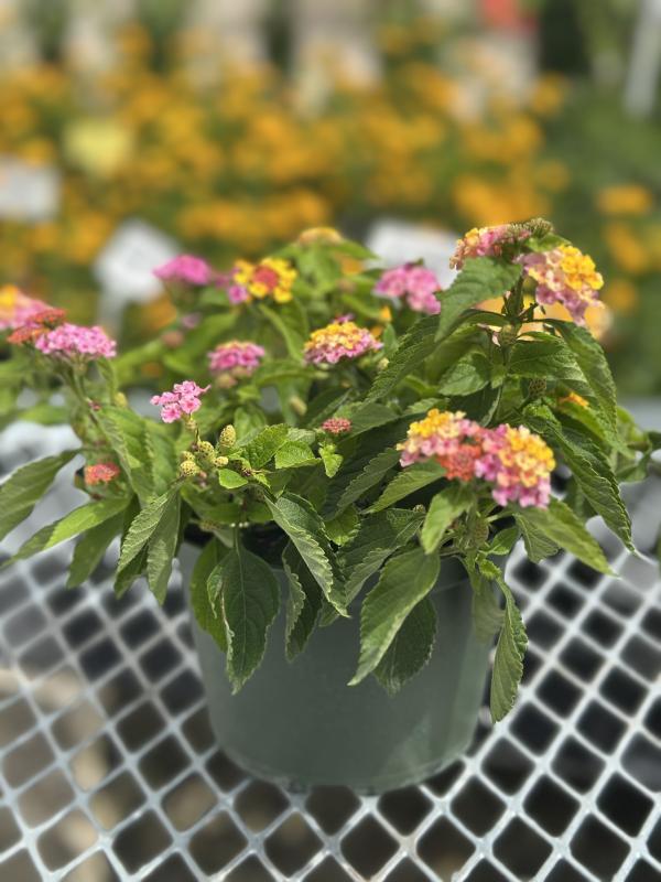 Lantana 'Gem Compact' (Lantana camara) is a low-growing, mounding shrub known for its continuous blooms and compact growth habit. It produces clusters of vibrant flowers that attract butterflies and other pollinators. This hardy plant thrives in heat and drought conditions, making it an excellent choice for garden beds, borders, and containers