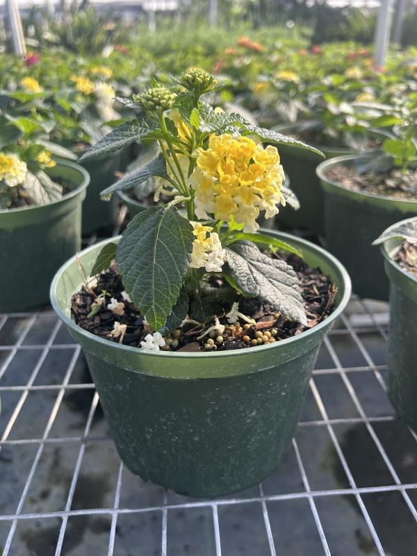 Lantana 'Gem Compact' (Lantana camara) is a low-growing, mounding shrub known for its continuous blooms and compact growth habit. It produces clusters of vibrant flowers that attract butterflies and other pollinators. This hardy plant thrives in heat and drought conditions, making it an excellent choice for garden beds, borders, and containers