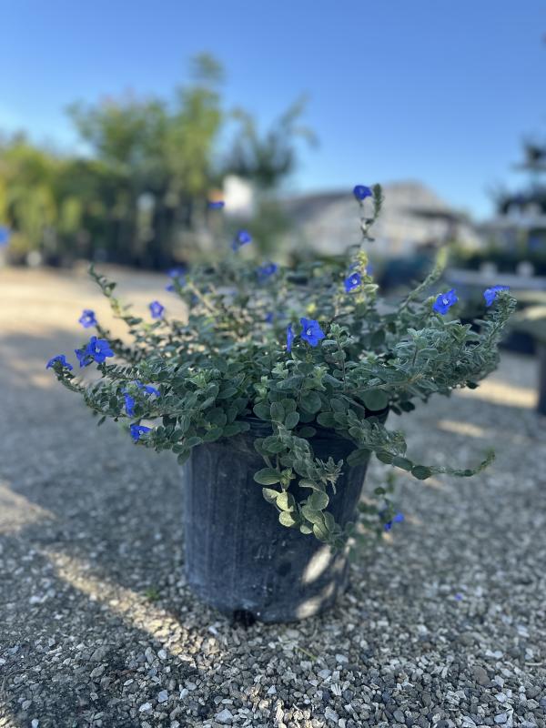 Blue Daze (Evolvulus glomeratus) is a low-growing, trailing plant known for its vivid sky-blue flowers and silvery-green foliage. It thrives in hot, sunny conditions and blooms profusely through the warm months, making it ideal for ground cover, borders, or spilling over the edges of containers. Blue Daze is drought-tolerant once established and requires minimal maintenance.