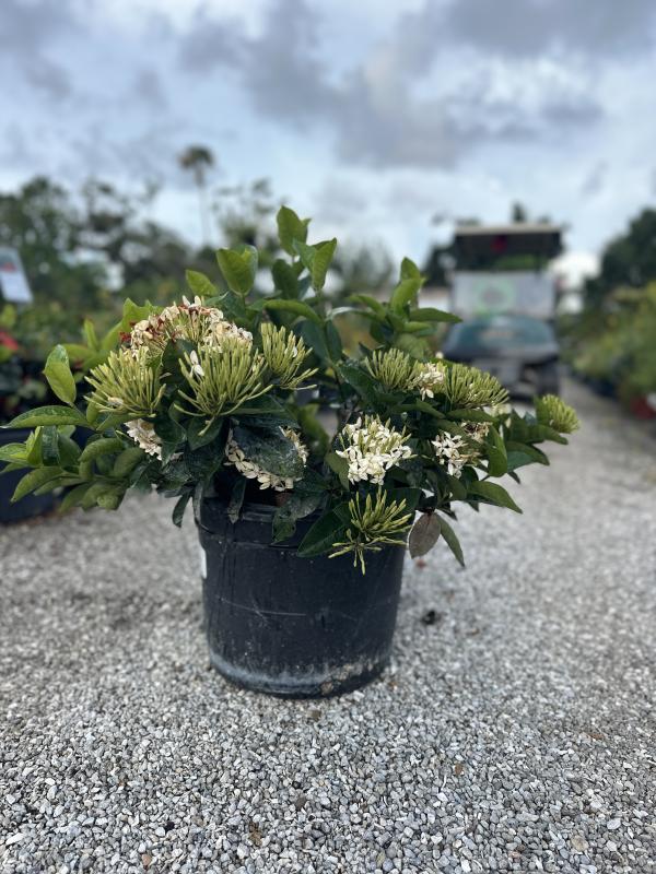 Nora Grant Ixora White (Ixora coccinea 'Nora Grant White') is a lovely tropical shrub known for its clusters of pure white, star-shaped flowers and glossy, dark green foliage. This compact, evergreen plant is perfect for adding a touch of elegance to gardens, borders, and containers, with its long-lasting blooms providing a clean, bright look throughout much of the year.