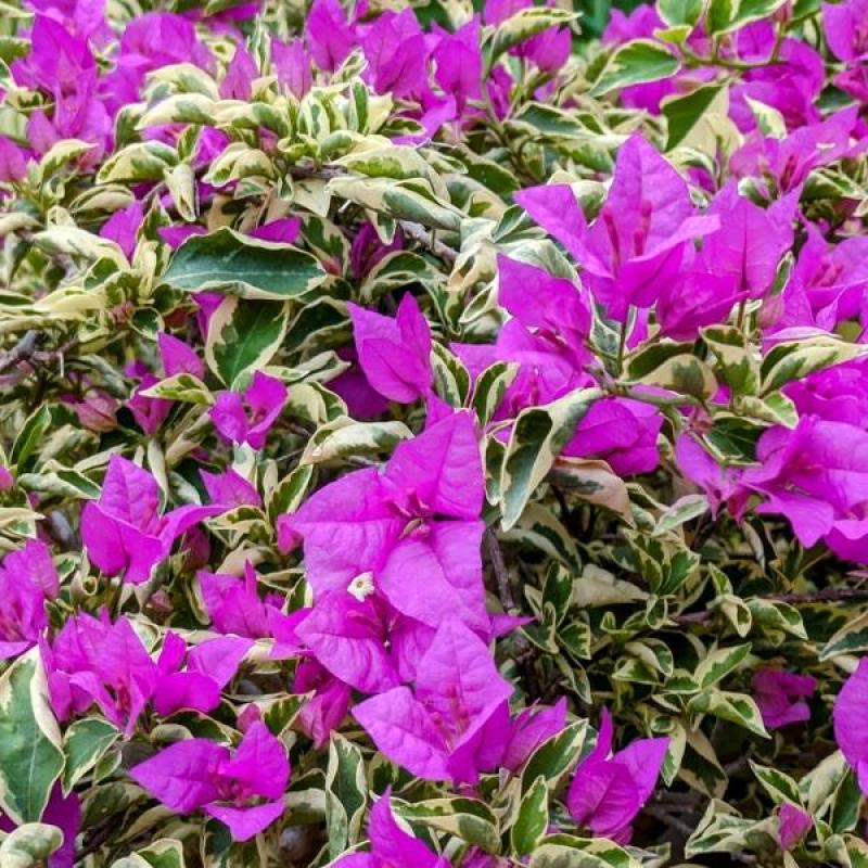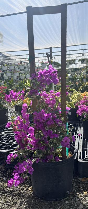 The Blueberry Ice Bougainvilleais a vibrant, ornamental shrub known for its striking purple bracts that resemble petals, complemented by green and white variegated foliage. This variety is particularly hardy, thriving in warmer climates and blooming profusely from spring to fall. Available in 3-7 gallon sizes, it adds a splash of color to landscapes and is great for trellises, fences, or as a colorful groundcover.