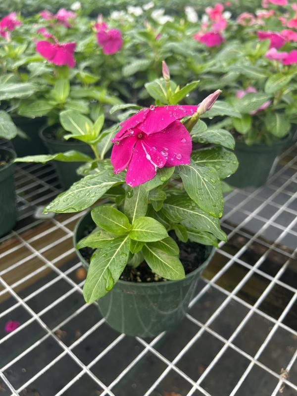 Vinca 'Valiant' (Catharanthus roseus 'Valiant') is a robust, upright variety of vinca known for its extra-large flowers and strong garden performance in hot, humid climates. It is ideal for mass plantings, borders, and containers, providing vibrant color throughout the warmer months.