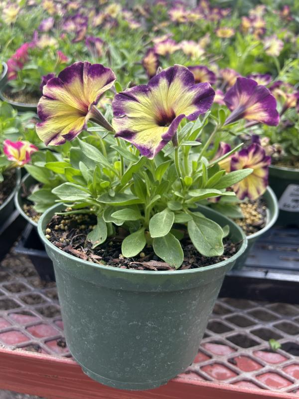 Petunia Crazytunia (Petunia spp.) is a variety of petunia known for its vibrant and unique blooms. The flowers are characterized by bold, striking colors and patterns that stand out in any garden or container. This variety is well-suited for full sun, where it will thrive, producing an abundance of colorful flowers throughout the warm months. It is a great choice for adding visual interest and texture to flower beds, hanging baskets, or window boxes.