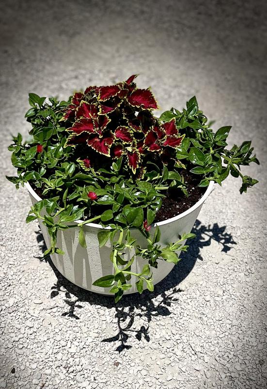 A vibrant, eye-catching mixed container designed to bring bold color and movement to any space. This arrangement features a striking coleus as the centerpiece, showcasing rich, multi-toned foliage that draws immediate attention. Surrounding it are three baby sunrose plants that quickly spread outward and gently cascade over the edges of the 14" decorative pot, softening the look with their trailing habit. As the sunrose matures, it creates a lush, spilling effect accented by small, bright blooms, adding both texture and contrast to the upright coleus. The combination offers a balanced blend of height, fullness, and flow, making it ideal for patios, entryways, or poolside areas where a full, finished look is desired.